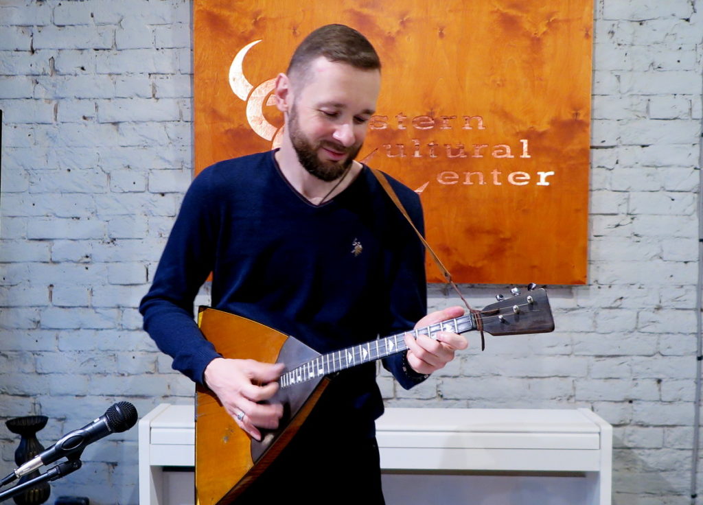 Заключительным аккордом вечера стало виртуозное исполнение на балалайке. Евгений Серебряный – выпускник МГИМ им. А.Г. Шнитке, лауреат международных конкурсов просто поразил. Его выступление по своей динамике и выразительности созвучно с представленными работами.